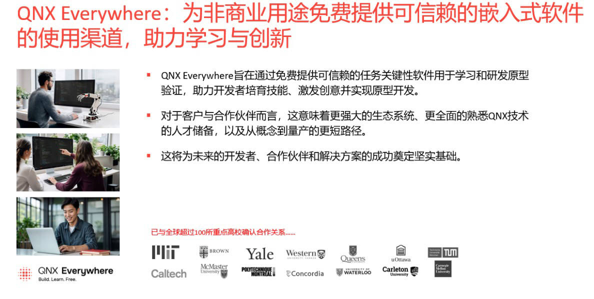目前,QNX Everywhere不仅面向整车与供应链企业,也免费向在校学生开放。在美国、加拿大、印度等地区的高校中,该项目也收到了积极的反馈。接下来,该项目将来到中国,向中国大学开放。
