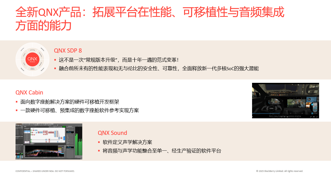 其中,QNX SDP 8是新推出的新软件开发平台,可以提供前所未有的高性能、功能安全与网络信息安全,可以用在不同芯片上。