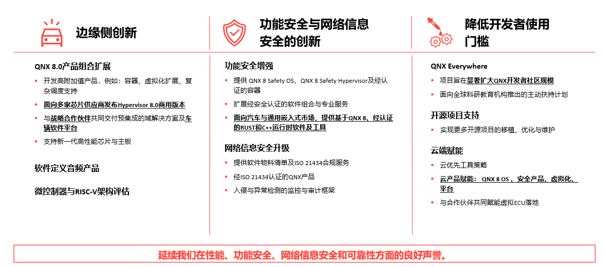 展望2026年及未来的规模化创新,John Moloney总结道:“我们有三个重要的支柱,第一个是在边缘侧创新,主要关注产品;第二个是更多关于功能安全和网络安全创新,提供功能安全和网络安全增强和升级;第三个要减少开发者麻烦和困难,比如我们推出QNX Everywhere,还有很多开源项目支持以及云优先的原则,提供本地云优先、本地赋能等等。”